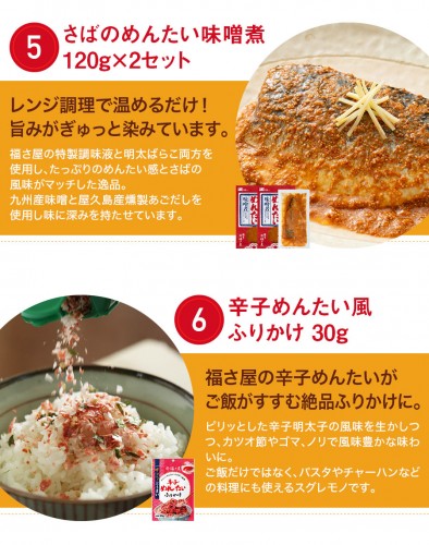 あごだし辛子めんたい90g、無着色辛子めんたい90g、辛口辛子めんたい90g、めんたい辛子たかな130g、さばのめんたい味噌煮120g×2、辛子めんたい風ふりかけ30g