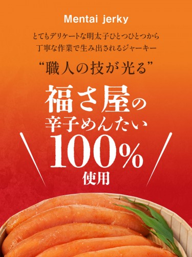 福さ屋のめんたいの皮を味付けし、そのまま乾燥させたジャーキー。めんたいの味をそのままお楽しみいただけます。