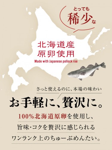 100%北海道原卵を使用し、旨味、コクを感じられるワンランク上のちゅーぶめんたい。
