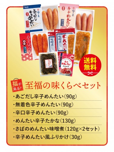 あごだし辛子めんたい90g、無着色辛子めんたい90g、辛口辛子めんたい90g、めんたい辛子たかな130g、さばのめんたい味噌煮120g×2、辛子めんたい風ふりかけ30g