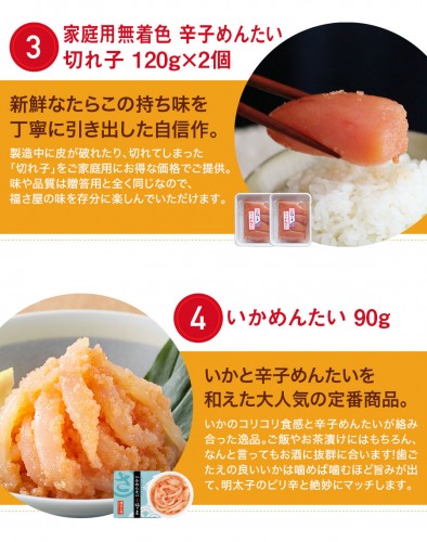 めんたいだし巻き270g、いかしゅうまい大まる8個入、家庭用無着色辛子めんたい 切れ子120g×2個、いかめんたい90g、博多ごまさば105g
