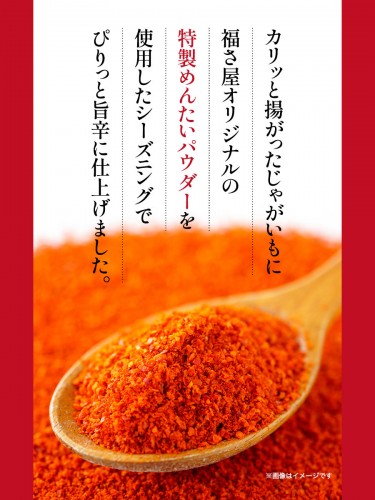 国産じゃがいもをバキュームフライで揚げ、食べやすいスティックタイプにカット。福さ屋オリジナルめんたいパウダーを使用したシーズニングでぴりっと旨辛に仕上げました。