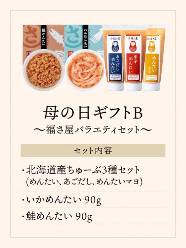 北海道ちゅーぶめんたいマヨ 70g、北海道ちゅーぶあごだしめんたい 70g、北海道ちゅーぶめんたい 70g、いかめんたい90g、鮭めんたい90gをセットにした母の日特別ギフト。